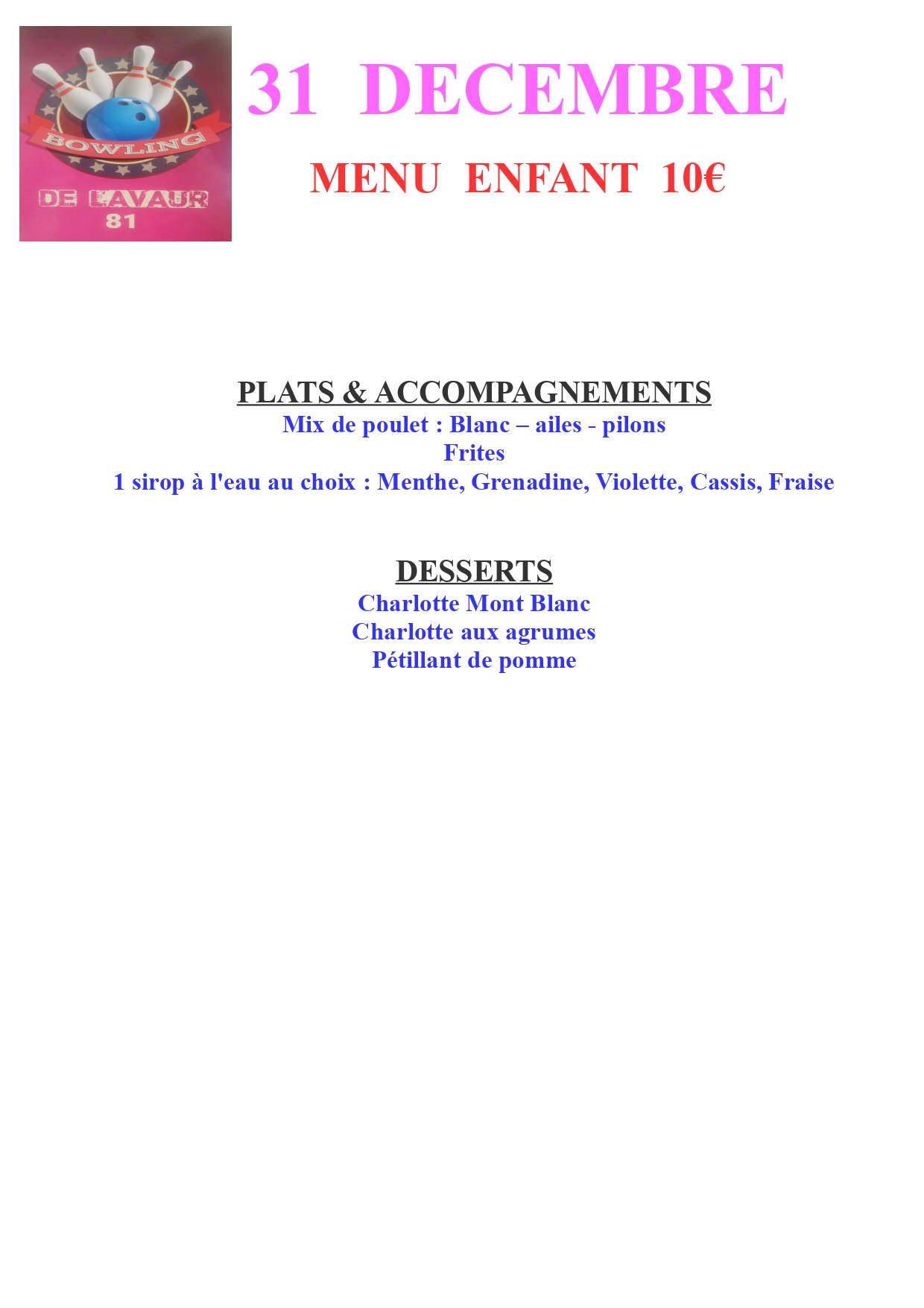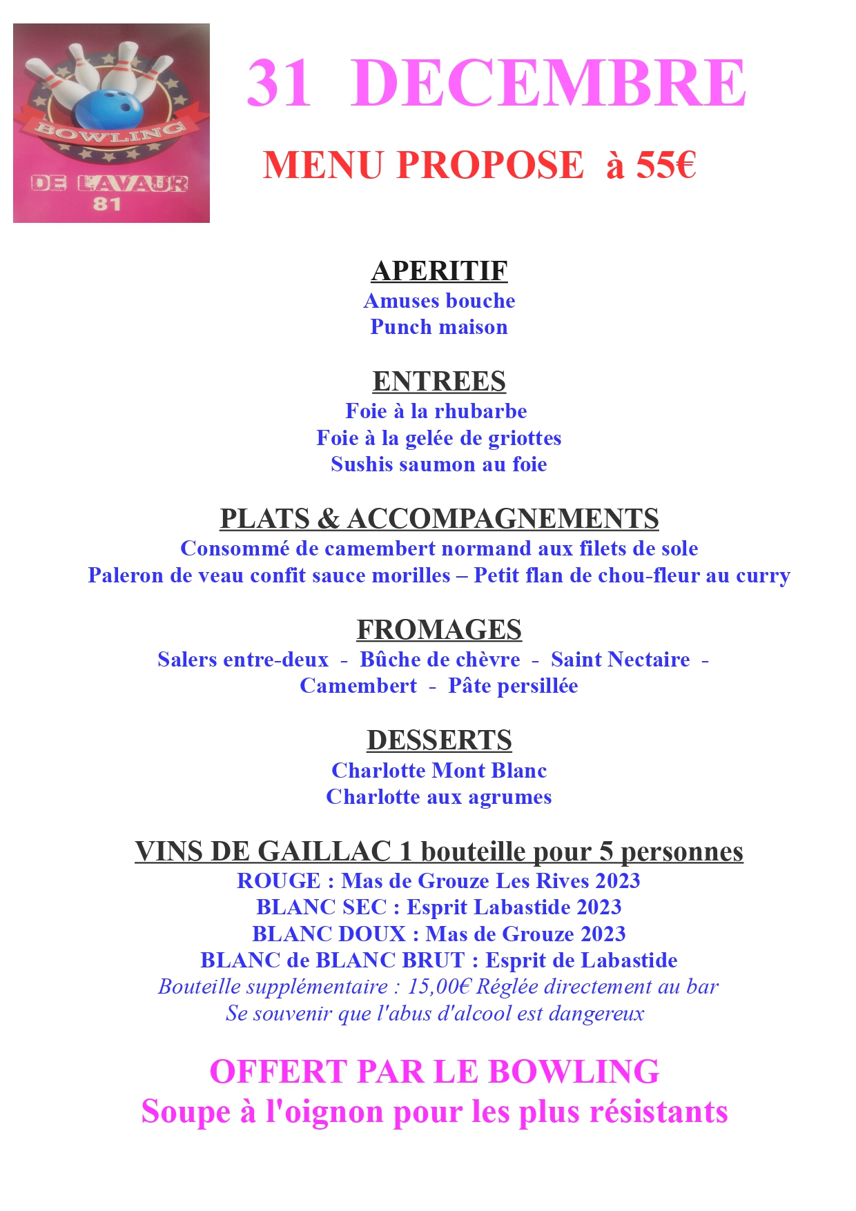 Le Bowling du Vaurais vous invite à célébrer la soirée du réveillon dans une ambiance festive et conviviale, avec un menu gourmand conçu pour ravir les papilles de toute la famille. Profitez d’un Menu Adultes à 55€ comprenant une sélection de plats , desserts élaborés pour l’occasion. Ce menu inclut des mets savoureux et des options variées pour satisfaire tous les goûts, parfait pour bien commencer la nouvelle année.